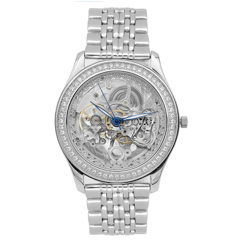 این ساعت نقره مردانه با طراحی اسکلتون، ترکیبی از هنر ایتالیایی و دقت ژاپنی است. موتور اتوماتیک میوتا، بدون نیاز به باتری و تنها با حرکت دست، عملکردی دقیق و پایدار را ارائه می‌دهد. بند رولکسی مقاوم و قابل تنظیم، به همراه نگین‌های باکیفیت و چرخ‌دنده‌های طلایی، جلوه‌ای خاص و لوکس به ساعت بخشیده است. این ساعت نه تنها نمایشی از مهندسی دقیق است، بلکه حس خاص بودن و اصالت را در هر جزئیات خود به نمایش می‌گذارد.