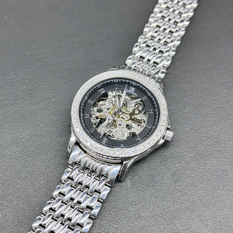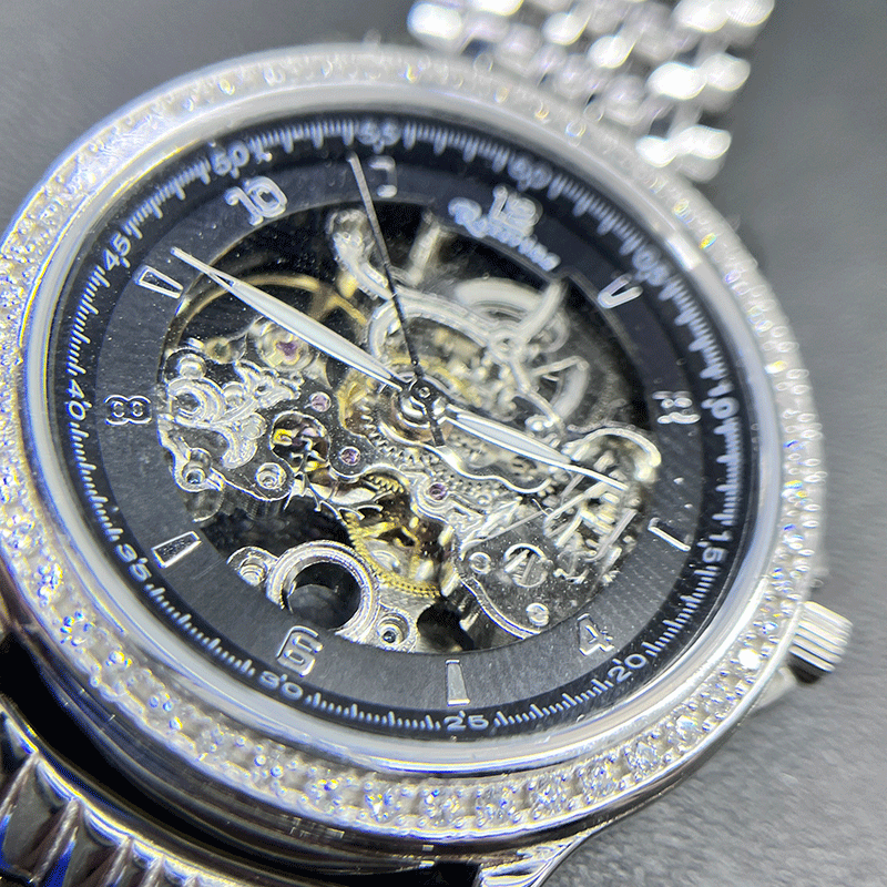 نگینهای مخراج شده دور قاب، با کیفیت بینظیر و تراش دقیق، نور را به زیبایی بازتاب میدهند و درخششی استثنایی به این ساعت اضافه میکنند. این نگینها به دقت انتخاب شده و با طراحی کلاسیک هماهنگ شدهاند تا ساعت را به یک اکسسوری لوکس تبدیل کنند. ترکیب رنگهای نقرهای، طلایی و سفید، به این مدل جلوهای منحصر به فرد و فوقالعاده بخشیده است که آن را برای آقایان شیکپوش و علاقهمند به ساعتهای خاص و لوکس مناسب میکند.