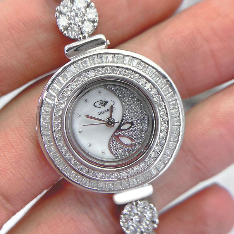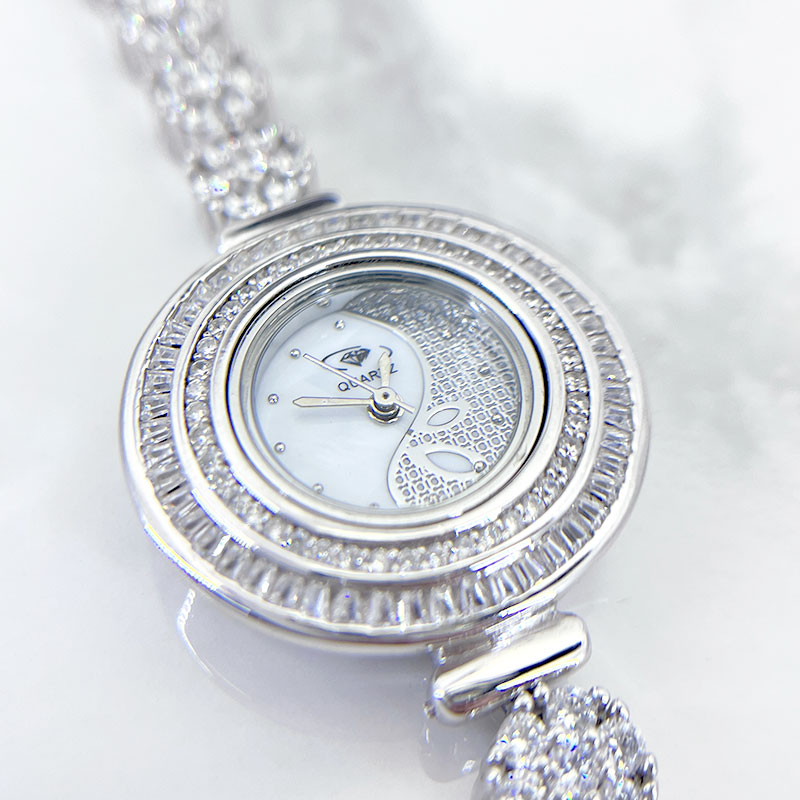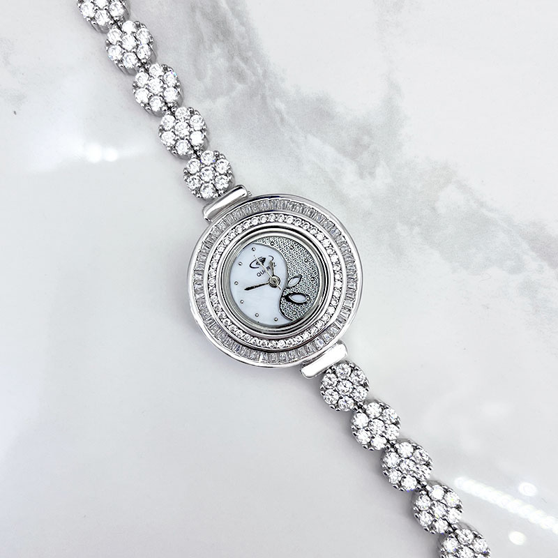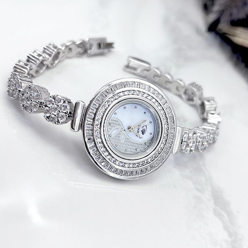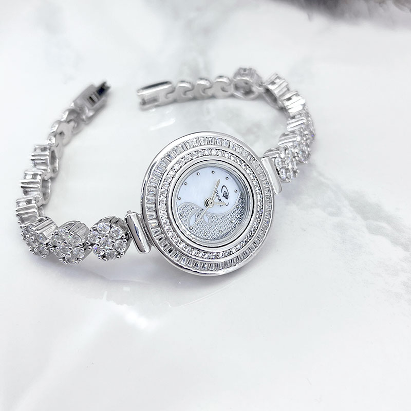 یکی از ویژگیهای برجسته این ساعت نقره زنانه جواهری، نگینهای باگت مخراج شده است که بهطور هنرمندانهای دور تا دور صفحه نمایش ساعت قرار گرفتهاند. این نگینها که به زیبایی تمام میدرخشند، جلوهای خیرهکننده به ساعت بخشیده و آن را به انتخابی ایدهآل برای استفاده در مهمانیها و حتی مکانهای روزمره تبدیل کردهاند.