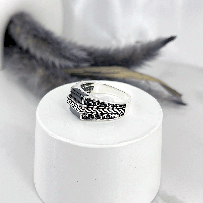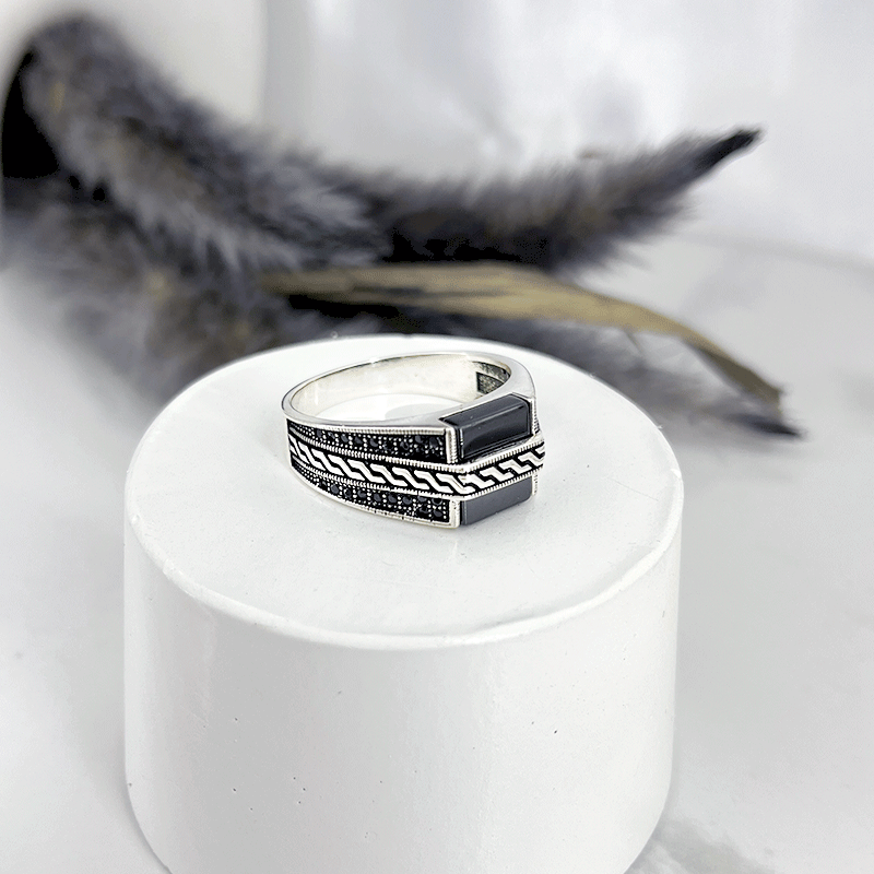 استفاده از عقیق مشکی در مرکز انگشتر اسپرت، نمایی شیک و در عین حال ساده ایجاد میکند. انگشتر نقره مردانه عقیق مشکی با مخراج اسپرت نگین های مشکی در کنار رکاب طرح کارتیر زیبایی آن را دوچندان میکند. رکابهای طراحیشده با الگوهای سهبعدی، به انگشتر حالتی متمایز و مدرن میبخشند. این طرحها با عقیق مشکی همخوانی جذابی دارند و باعث برجستهتر شدن آن میشوند.