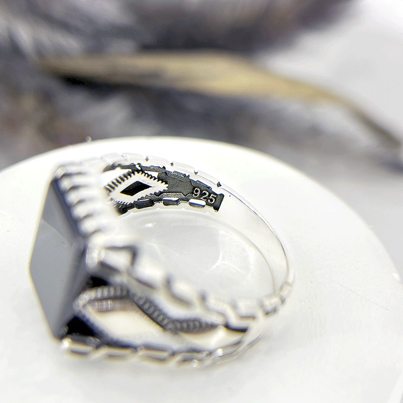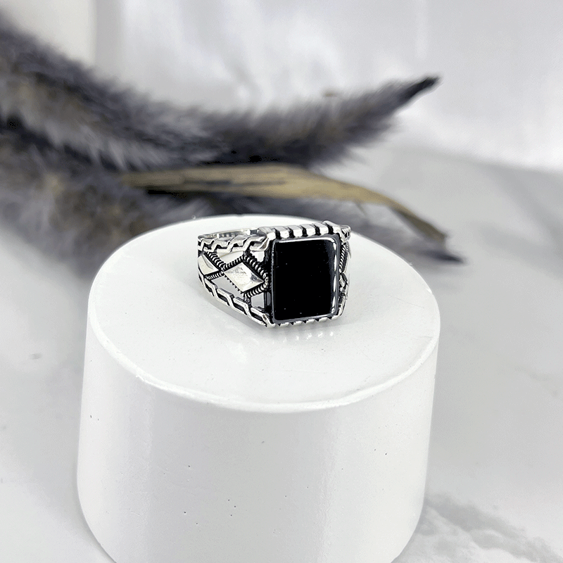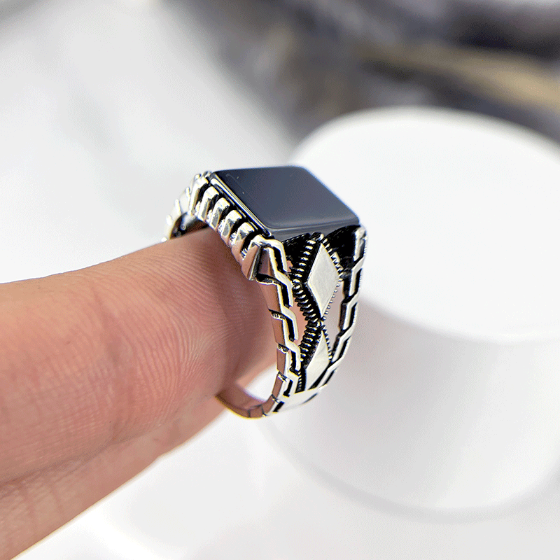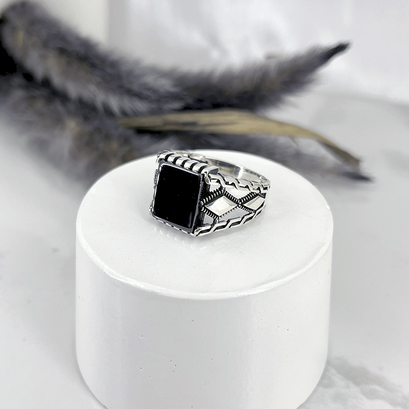استفاده از عقیق مشکی مربع در مرکز انگشتر، نمایی شیک و در عین حال ساده ایجاد میکند. انگشتر نقره مردانه اونیکس اسپرت با مخراج اسپرت نگین های مشکی در کنار رکاب طرح لوزی زیبایی آن را دوچندان میکند. رکابهای طراحیشده با الگوهای سهبعدی، به انگشتر حالتی متمایز و مدرن میبخشند. این طرحها با عقیق مشکی همخوانی جذابی دارند و باعث برجستهتر شدن آن میشوند.