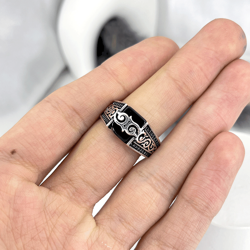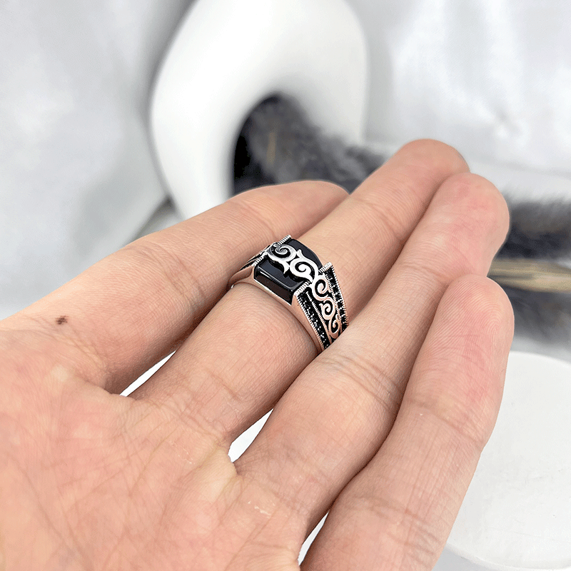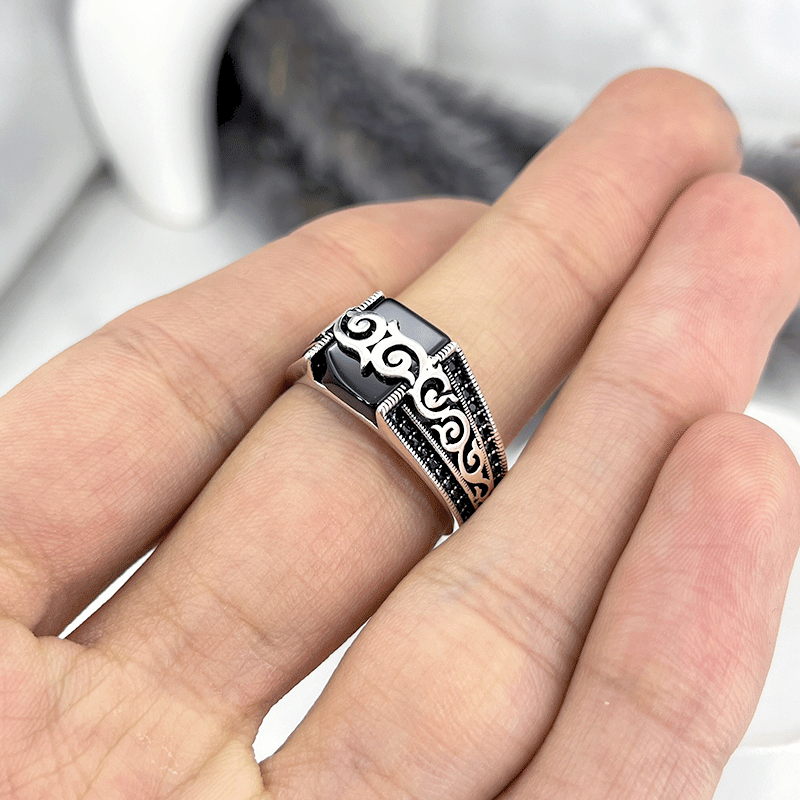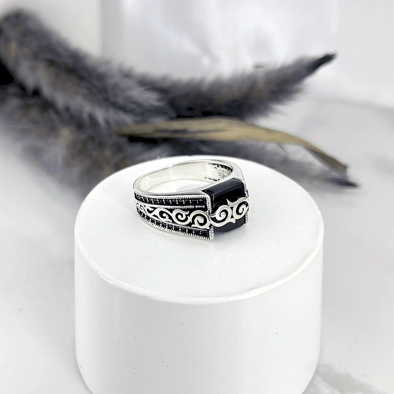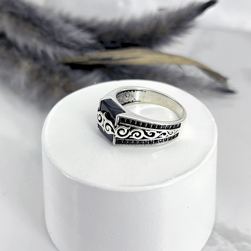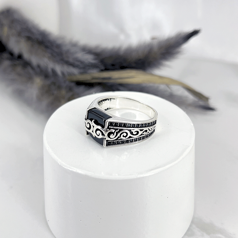 استفاده از عقیق مشکی در مرکز انگشتر اسپرت، نمایی شیک و در عین حال ساده ایجاد میکند. انگشتر نقره مردانه عقیق مشکی با مخراج اسپرت نگین های مشکی در کنار رکاب طرح مارپیچ زیبایی آن را دوچندان میکند. رکابهای طراحیشده با الگوهای سهبعدی، به انگشتر حالتی متمایز و مدرن میبخشند. این طرحها با عقیق مشکی همخوانی جذابی دارند و باعث برجستهتر شدن آن میشوند.