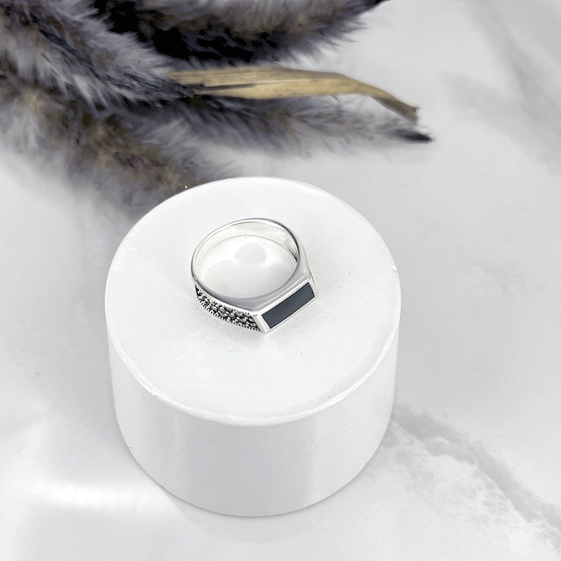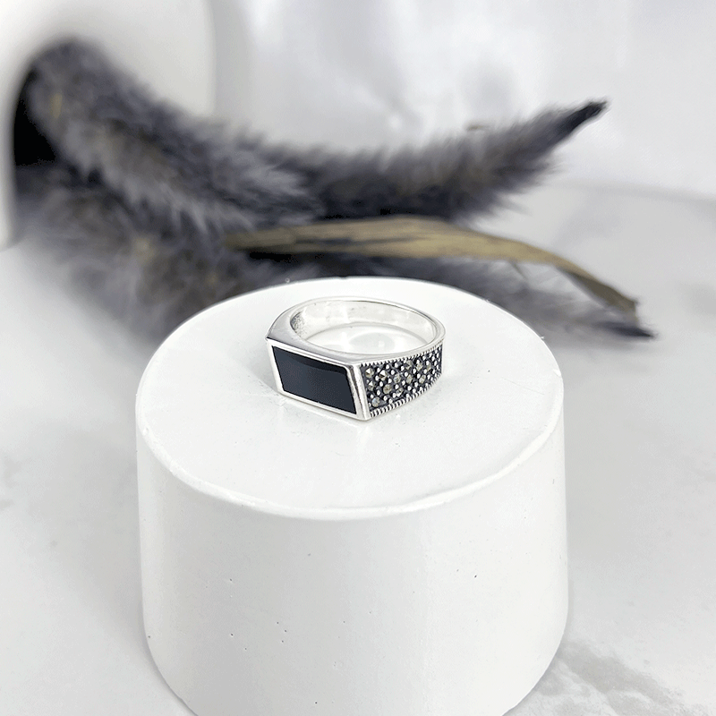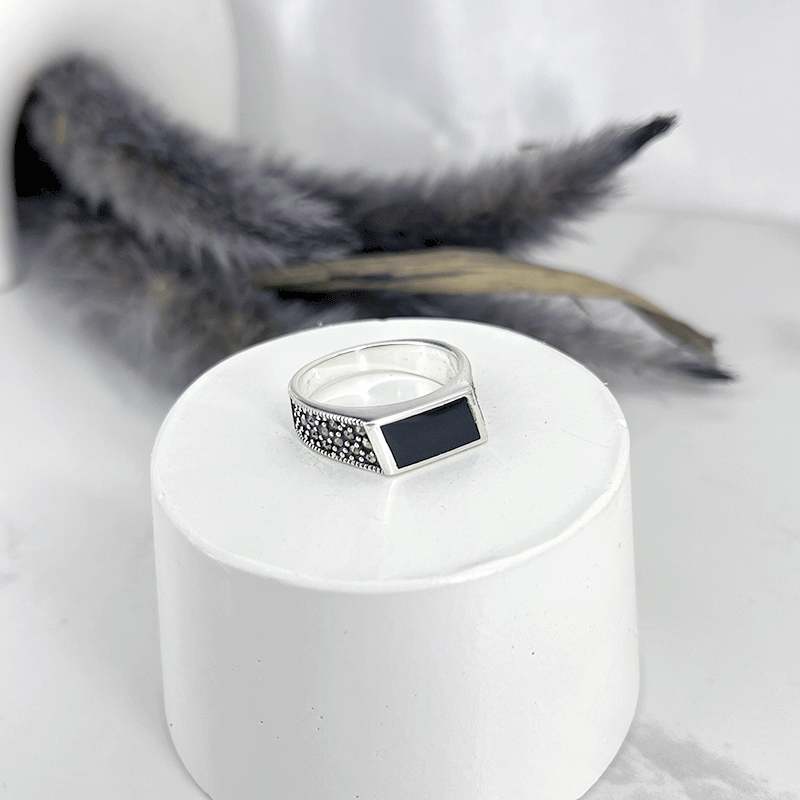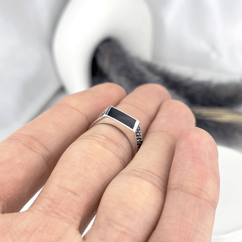 استفاده از عقیق مشکی در مرکز این انگشتر و به کارگیری نگین های مارگازیت در کنار رکاب، نمایی شیک و در عین حال ساده ایجاد میکند. انگشتر نقره مردانه ساده در کنار رکاب ساده زیبایی آن را دوچندان میکند. رکابهای طراحیشده با الگوهای سهبعدی از نگین مارگازیت، به انگشتر حالتی متمایز و مدرن میبخشند. این طرحها با عقیق مشکی همخوانی جذابی دارند و باعث برجستهتر شدن آن میشوند.