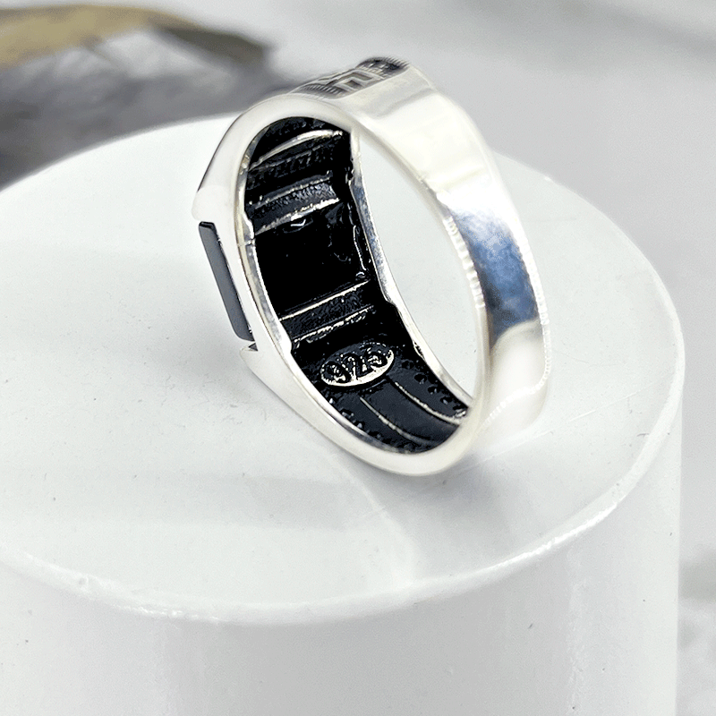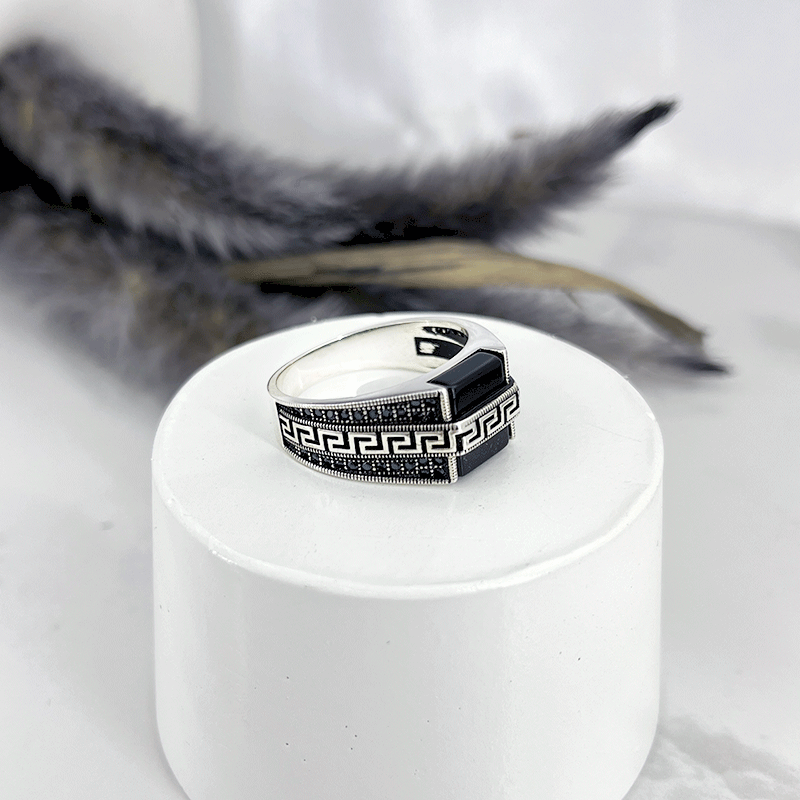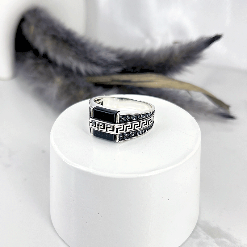 استفاده از عقیق مشکی مستطیل و نوار ورساچ در مرکز انگشتر، نمایی شیک و در عین حال ساده ایجاد میکند. انگشتر ورساچ نقره مردانه با مخراج اسپرت نگین های مشکی در کنار رکاب طرح لوزی زیبایی آن را دوچندان میکند. رکابهای طراحیشده با الگوهای سهبعدی، به انگشتر حالتی متمایز و مدرن میبخشند. این طرحها با عقیق مشکی همخوانی جذابی دارند و باعث برجستهتر شدن آن میشوند.